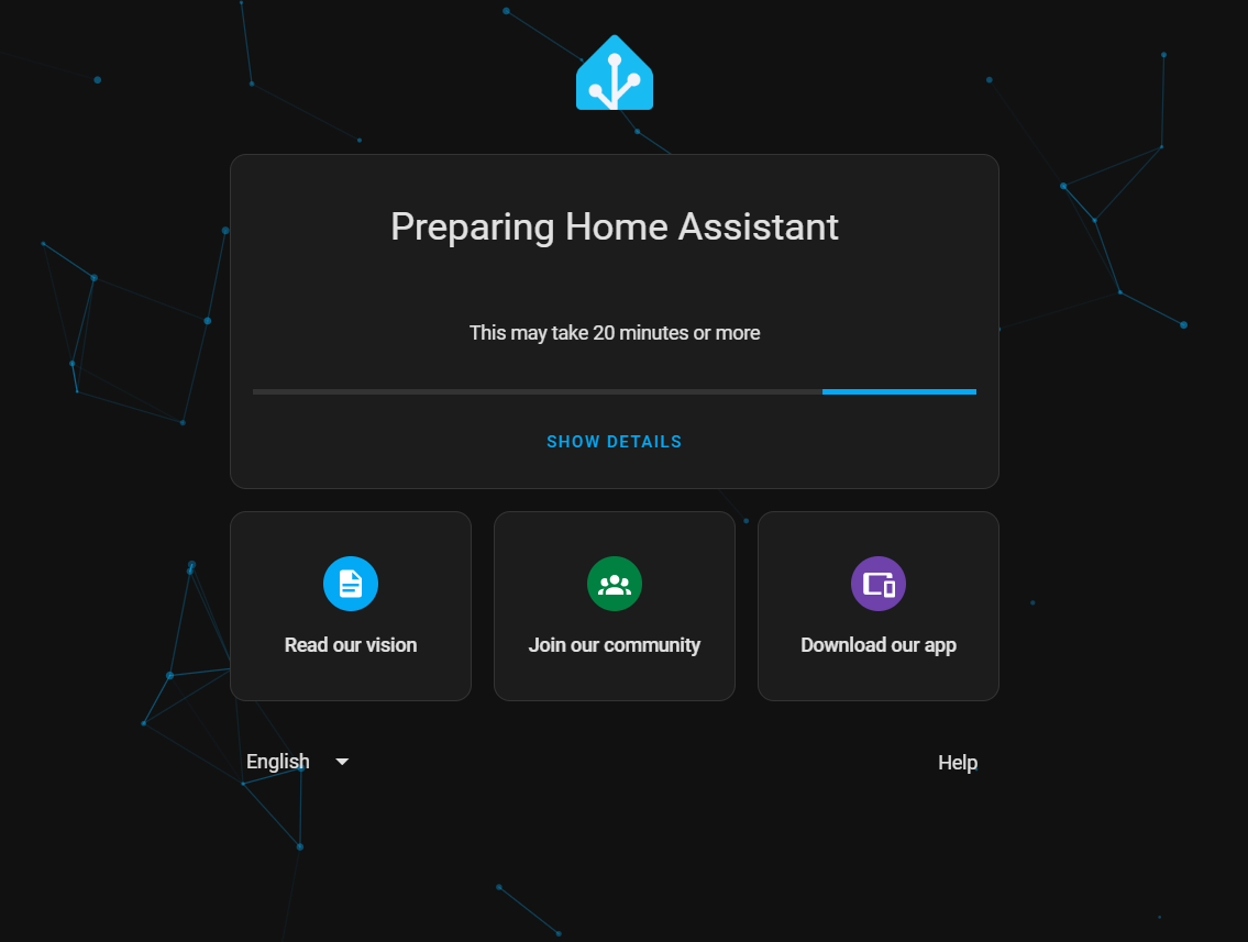 3. Once the page is loaded, you’ll see a bar a page with the heading Preparing Home Assistant, if so give it some time to finish setup. You can use this page to setup a new Home Assistant or upload a backup.