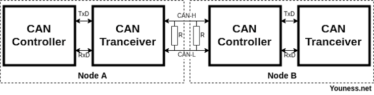 | CAN controller needs a send/receive chip to adapt signals to CAN Bus levels. Controller and Transceiver are connected by two wires TxD and RxD. Examples: MCP2551, TJA1040… | ![]() |