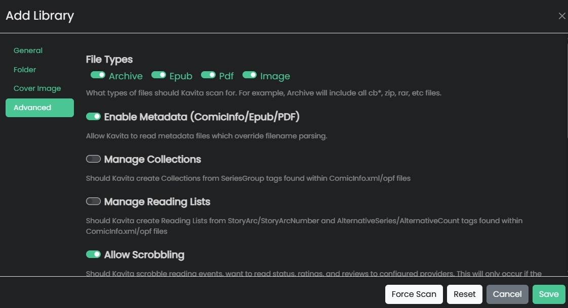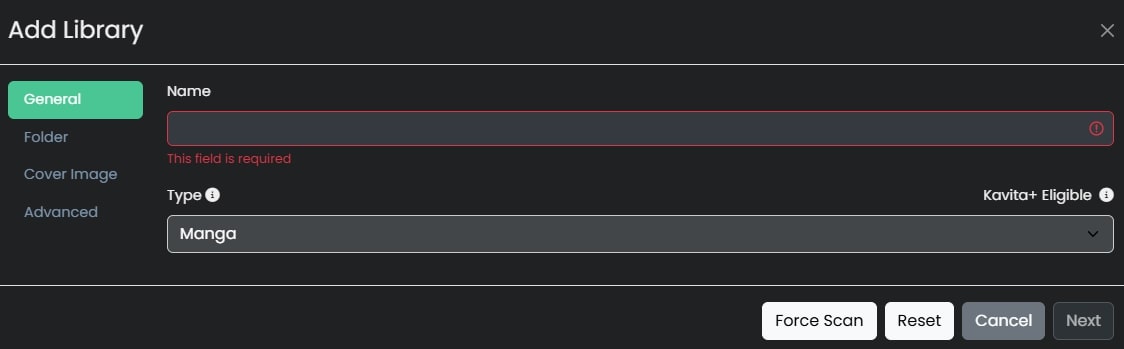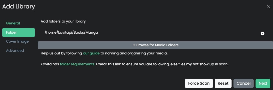 Click on Add Library, and a pop-up will show with text boxes for entering your library name. Fill in the name and type, then click next, and choose the folder where your books are stored. In the Advanced section, you can choose different file types for your library or change other settings. You should be able to find the library in your menu on the home page, then! Just remember to click the 3 dots and scan the library for your books to show.